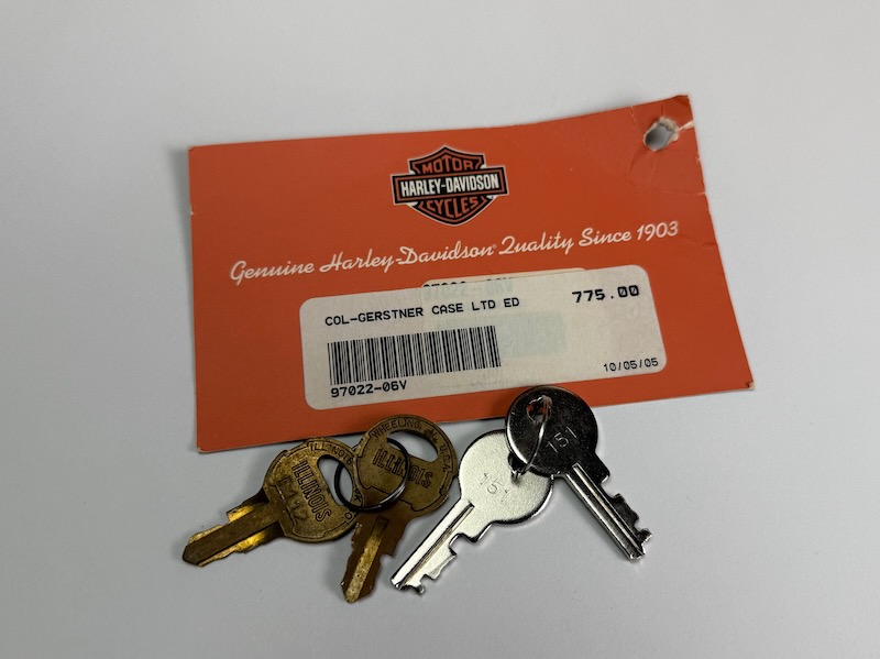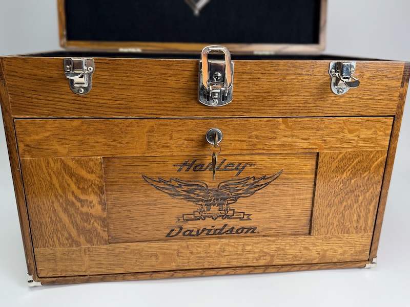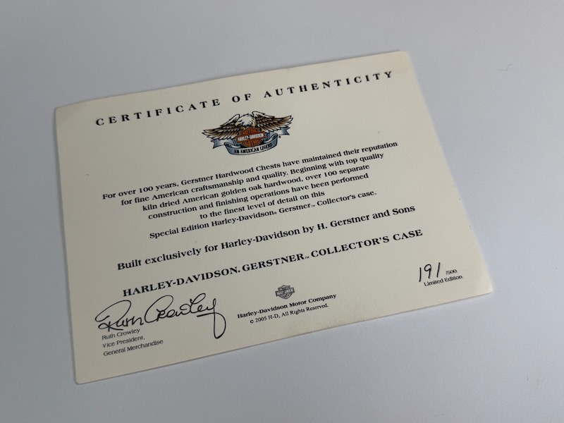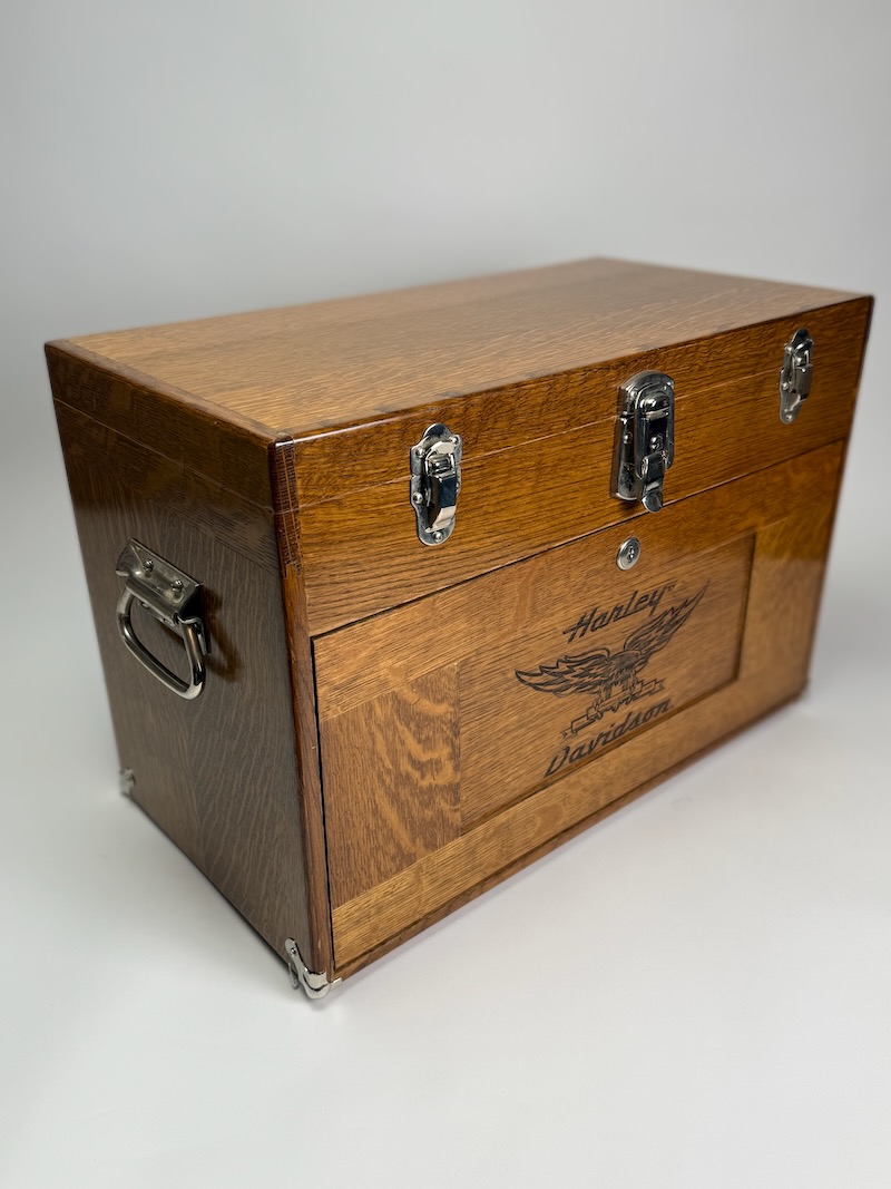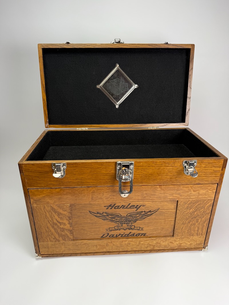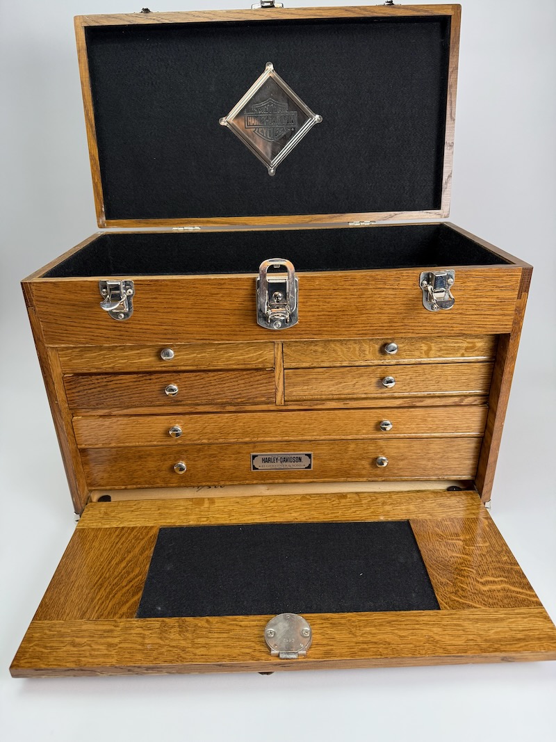 2005 H. Gerstner & Sons 'Harley Davidson' Special Edition Tool Chest Model No. 46 produced in quartersawn white oak wood in the golden oak color tone. This was a special production of only 500 chests made exclusively for the 'Harley Davidson' Company still retaining its hang tag and signed and numbered laminated documentation card with the production number being one of the first 50 chests made at #47 coming from a the personal collection of a Gerstner distributor with the size being 20" Wide x 10-1/2" Deep x 13-1/2" High X Weight 24Lbs. The inside of the bottom of the chest is stamped in black ink showing the Gerstner name,model number being 46, production number along with the date made and Harley Davidson's inked stamp as well. The front of the drop-down lid displays a large engraved Harley Davidson eagle logo along with the mirror also having the Harley logo which has been acid etched from the backside of the mirror and the inside of the top well and all drawers being lined with a rich black felt having all nickle plated hardware including drawer knob back plates.