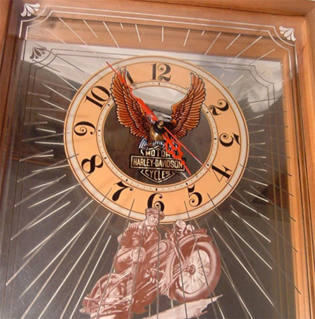 Harley Davidson Mirrored Wall clock 12" X 15" Solid walnut Frame Construction Battery 99230-84V Excellent condition