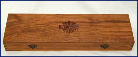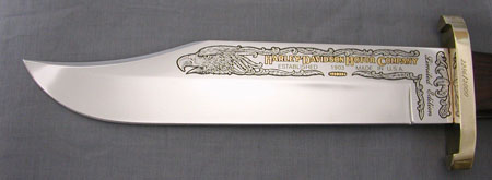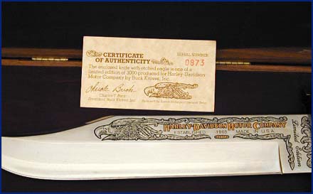 The Limited Edition Bowie Knife 99127-84V has a 10'' stainless blade with an acid etched eagle with the Motor Company name in 22K gold overlay. The handle is crafted from Coca Bola, a rare and valuable hardwood. It comes in a laser engraved solid walnut presentation case includes certificate of authenticity 1 of 3000 made by Buck Knives Inc.